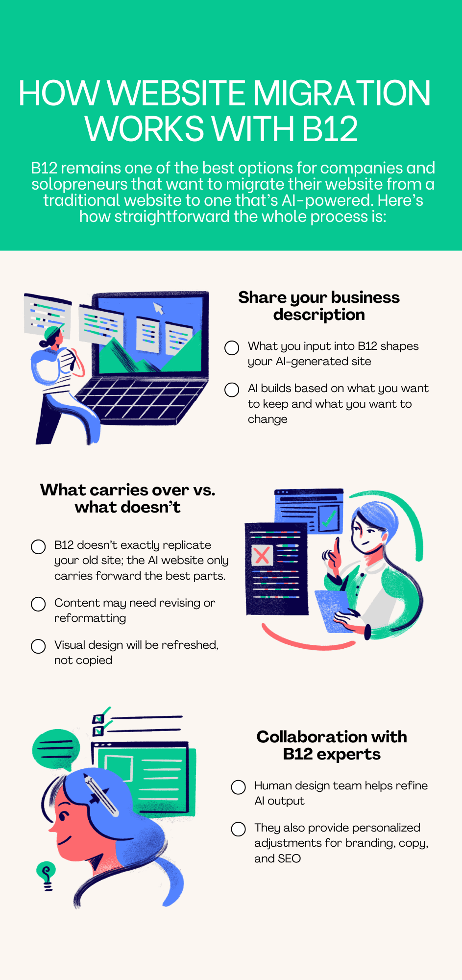 Instead, you only need to carry forward the strongest parts of your entire website while setting the stage for smarter automation and all the features you’ve been missing. If you plan to transition from a traditional builder to an AI builder like B12, here are the key steps to take: