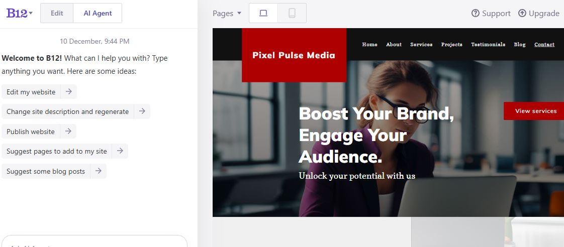 - Key features: B12's AI-powered platform offers full AI website creation (content, layout, and images), human-assisted design with a strong SEO foundation, and powerful conversion tools. You have full access to a section-based visual interface and an AI Agent that lets you refine pages using simple natural language descriptions. This AI tool also includes custom domain support and a prompt gallery of templates tailored to industry-specific websites.