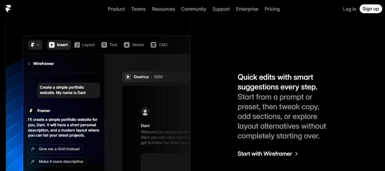 - Key features: Framer's AI-powered tools offer stunning modern designs, fast AI layout generation, and natural language prompts. It also includes a visual editor and support for advanced UI layouts and animations.
