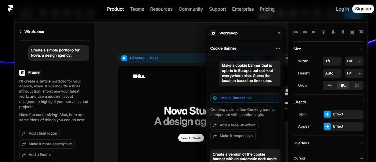 If your priority is creative freedom, modern animations, and visual storytelling, Framer AI is a strong fit. The tool uses artificial intelligence to sketch out layouts, and then you can tweak everything down to the micro-interactions. It’s excellent for landing pages that feel alive rather than rigid.