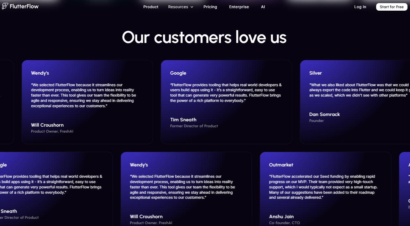 A carousel layout, such as on FlutterFlow’s homepage, rotates the testimonials, allowing every visitor to see credible names or metrics. Using lead capture points near these testimonials can boost conversions even further.